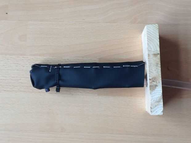 Mientras cubría la cabeza con cuero de la parte delantera de la cabeza (y el pico - no como en las fotos) no esté bien. Cuando haya terminado la cabeza cortar una cruz en el cuero de donde proviene el tubo y el pico. Empuje el tubo desde la parte delantera lado aunque la Cruz y el plomo bajo el bonsai de la caja a través del corte de ruta. Enrosque el pico al frente (es un poco complicado) y el frente en la cabeza.