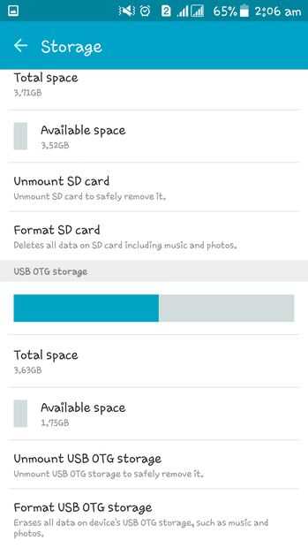 En la primera foto cuando no inserté el OTG pendrive su Mostrar dispositivo almacenamiento y tarjeta SD. En la segunda imagen cuando inserté el OTG pendrive su Mostrar dispositivo almacenamiento, tarjeta SD y USB almacenamiento USB A. A soportes para pluma OTG unidad primero. Se puede ver en imagen tercero al abrir ajustes almacenamiento su almacenamiento USB OTG de mostrando que es de 4 GB. Puede utilizar más de 4 GB es totalmente depende de ti.