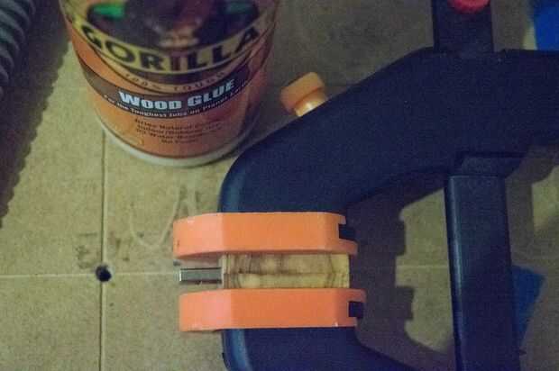A continuación se pegue su caso cerrado. Utilice pegamento para madera, pegamento caliente no será lo suficientemente fuerte. Limpiar los bordes de cualquier polvo y cubrir con pegamento para madera. Junte las dos mitades y asegure en una mordaza de alguna clase. Esto debe dejar secar durante la noche.