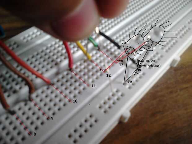 -Poner el end(-ve) más corto de cada uno llevó a la línea de tierra común en la línea vertical -Ponga el end(+ve) más largo de cada led al cable de colores respectivo conectado línea horizontal