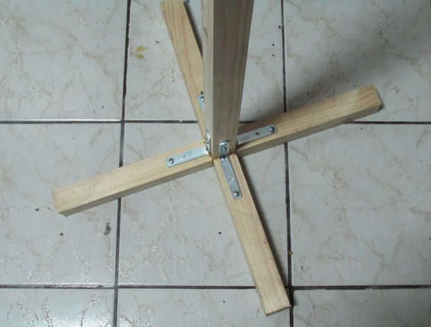 Lo he hecho de la siguiente manera, utilizando ángulos y tablas simples he construido bases en forma de Cruz y estructuras laterales han colocado unas bisagras para doblar el péndulo y moverse fácilmente de un lugar a otro.