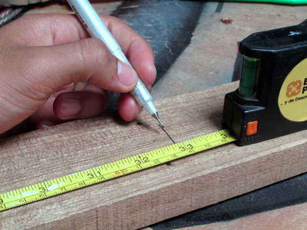 Con la ayuda de una cinta métrica, te marca la mitad de nuestra mesa, que será las bombillas colgando.