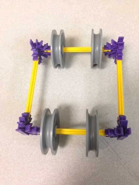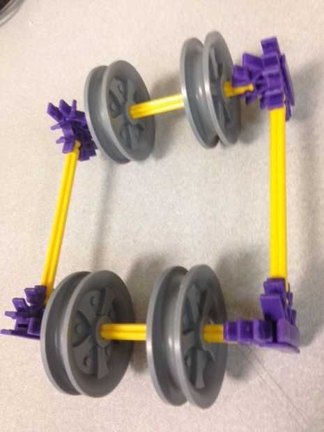 Deslice las ruedas sobre las varillas amarillas sin conectores en los extremos. Conecte las varillas a la ranura media vacía del conector vacío opuesto de piezas. Debe tener una plaza con cuatro ruedas en él.