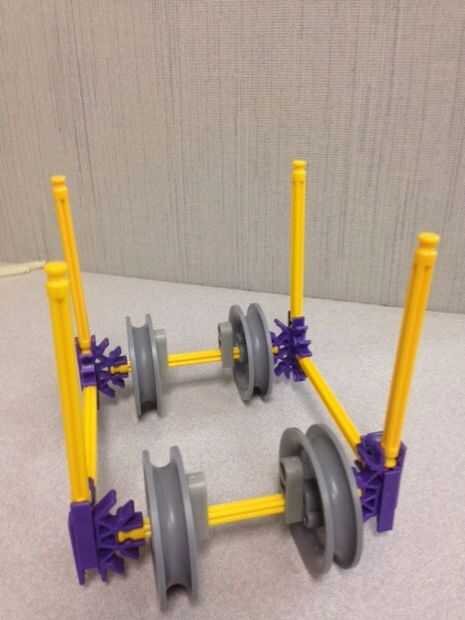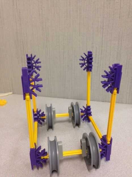 Añadir barras amarillo va hacia arriba de los pedazos de la púrpura de la conexión. Añadir a continuación cuatro de las piezas de conexión púrpura conectado a la parte superior de las barras del amarillo hacia arriba para que sirven las ranuras de la parte inferior.