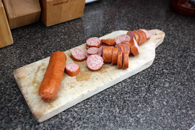 Comienza por cortar la salchicha de carne de res ahumado en lonchas finas.