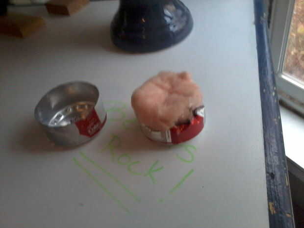 -colocar fibra de vidrio dentro de una de las latas y lo embalamos en. Luego ponga los dos extremos en la parte superior unos a otros y archivo los bordes ásperos