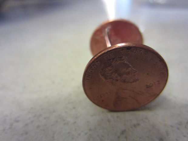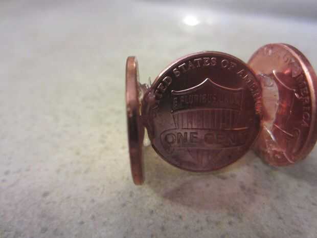 Tome una de sus monedas y coloque un poco de pegamento caliente en el centro de la misma. Antes el pegamento caliente seca Presione el borde de una moneda diferente en el pegamento caliente, para que está parado vertical. Asegúrese de que esté perpendicular a la primera peseta. Repita este proceso para el lado opuesto del penny vertical.