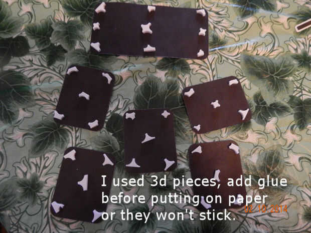 Colocar en la parte superior con el rodillo de adhesivo. Utilizando x-acto cuchillo Hágale un agujero en cada esquina y pegar en un pequeño brad.