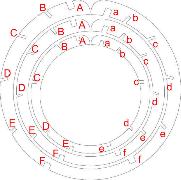En tercer lugar, a a & F a f y B a b y E, C a c & D a d entonces continuar hasta el final todas las siete piezas. Va a ser más difícil con más pedazos en él.