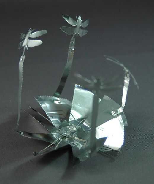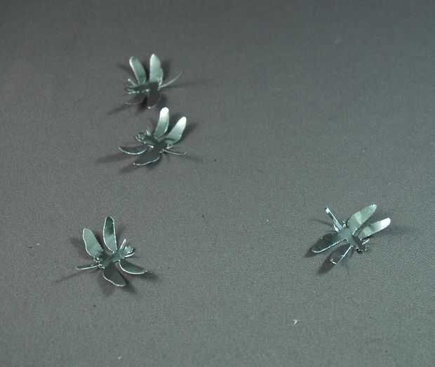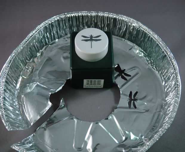 En primer lugar, tomé un punzón para papel y perfora hacia fuera cuatro libélulas. El golpe funcionaba mejor en esta hoja que siempre tiene en el papel.