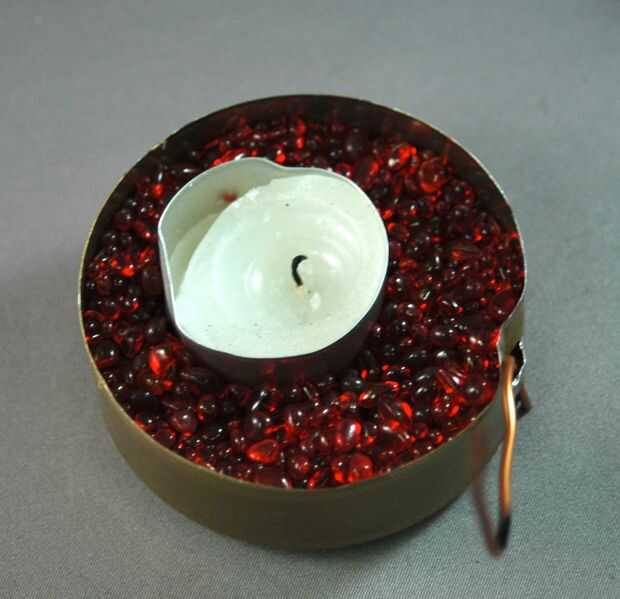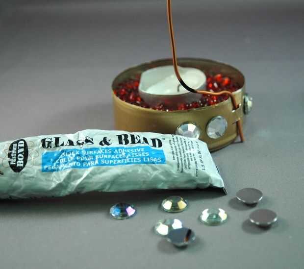 Lo primero que hice fue llenar la base con vidrio rojo. Esto hace que se vea festiva y también aumenta la estabilidad, lo que es menos probable que la vela se volcará.