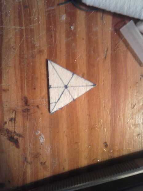 Para hacer el cubo de tres caras, dibujar un equilátero (60 + 60 + 60 grados) triángulo con cada 25 mm de arista. Para encontrar el centro de este triángulo, trazar líneas desde cada esquina punto medio de la frente. El punto de encuentran de estas tres líneas es el centro del eje (ver figura 6).