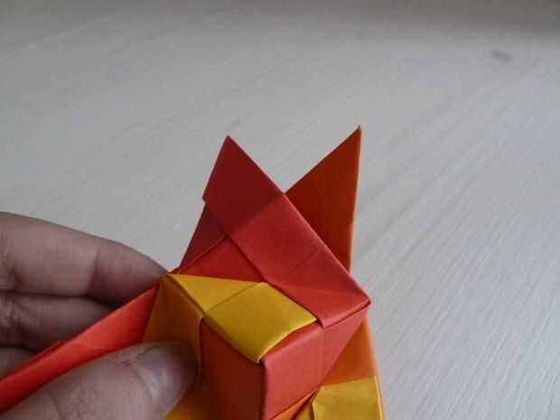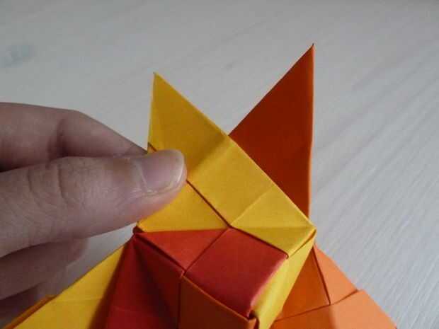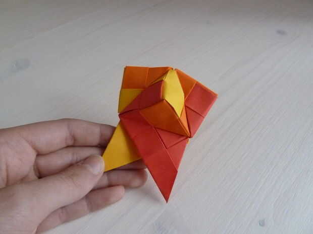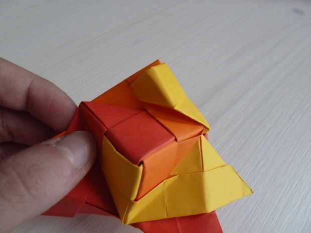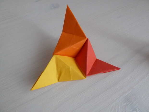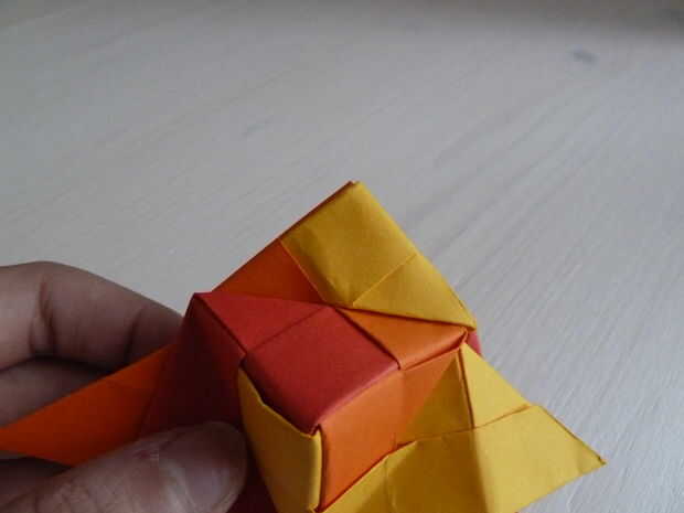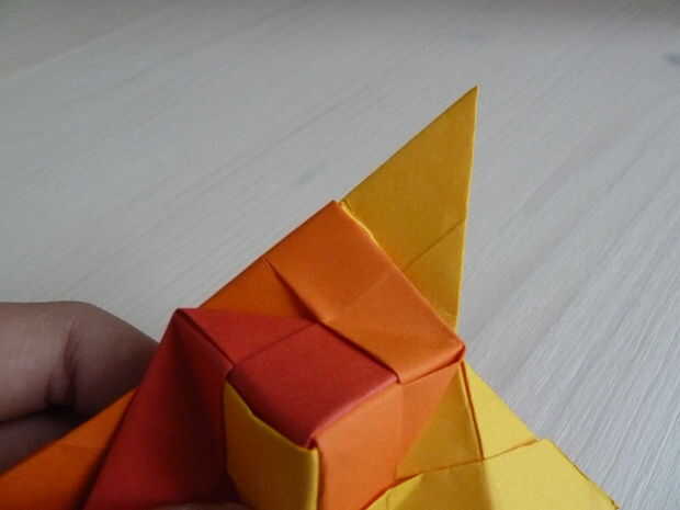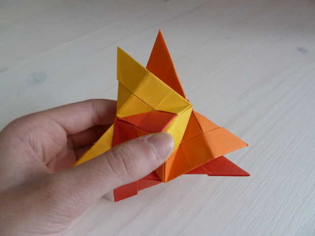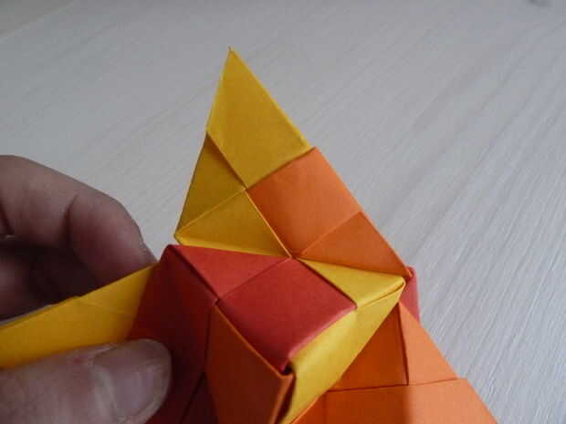 Tomar una de las partes del triángulo hechas en el último paso y ponerla abajo como se muestra. Coloque la otra parte encima. Para unirse a ellos, (colores otra vez aquí hablando) pone el triángulo naranja en el bolsillo amarillo. Después de eso, la vuelta la cosa completa y poner el triángulo amarillo en el bolsillo naranja. Repetir este proceso para los otros dos lados.