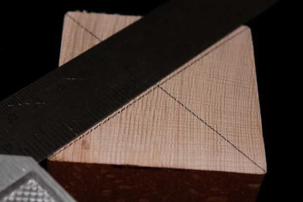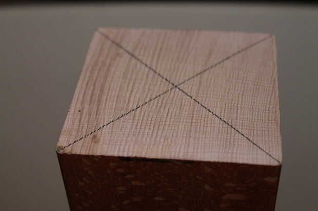 Luego marqué el centro de ambos extremos del bloque de madera dibujando líneas rectas entre las esquinas diagonales.