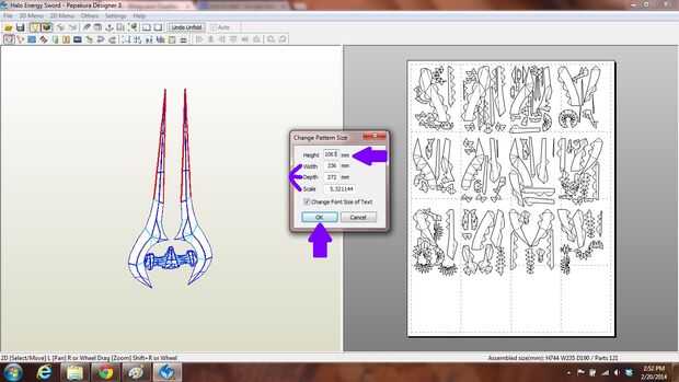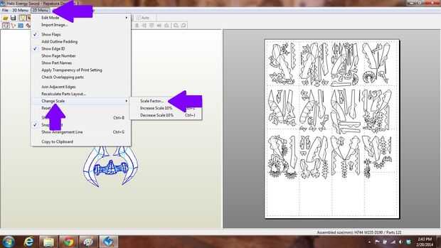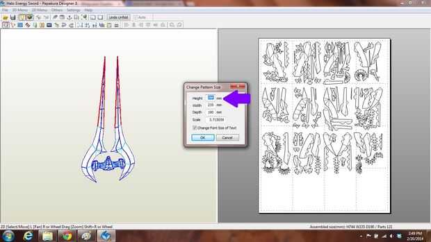 Bajo el menú 2D hay cambio de escala, se ciernen sobre este y otro menú se abrirá con la mejor opción es el Factor de escala, haga clic en este. Aparece una ventana pronto con altura, anchura, profundidad y escala. Observe que la medición mm 743,95 está muy cerca de lo 744 mm que está en el cuadro de altura. En el cuadro altura, escriba en el 1067 milímetros (redondeado el 1066.8), verás los otros números cambiar demasiado, el auto de software corrige las otras cajas para mantenerlos proporcional. Después haga clic en aceptar, usted puede ver que las piezas han conseguido más grandes.