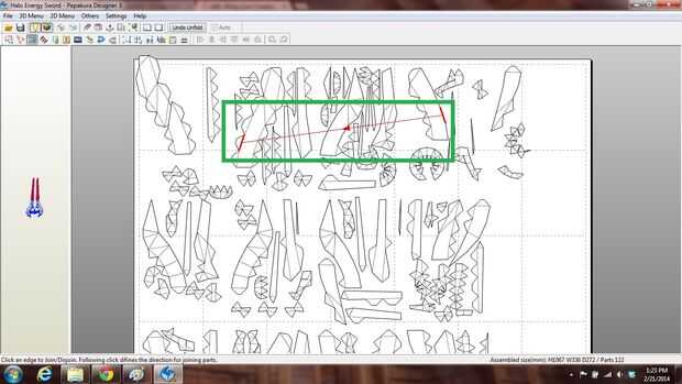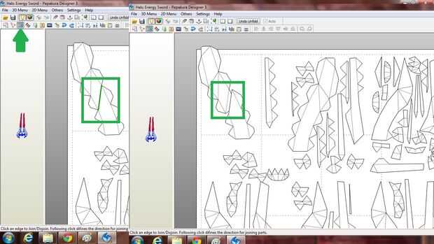 Vamos a empezar con esta gran pieza en la esquina. Primero necesitamos lo divide en una hoja más pequeña. Escogí un lugar en el centro de la pieza por lo que sería más fácil mostrar lo que estaba haciendo. Haga clic en la herramienta de unir/separar, cuando pasa el ratón sobre las piezas te darás cuenta de que una línea verde y roja empiezan a aparecer. Escoger un lugar en la pieza que tiene una línea verde y haga clic en nuevo. Se puede ver cómo la pieza se separa en esa línea, se auto genera una nueva pestaña en uno de los lados de la fractura. Si pasa el cursor sobre la misma área que usted verá dos líneas rojas aparecen con una línea entre ellos, esta es la función de unir. Si no como lo que se divide una pieza, haga clic en nuevo y arreglará a sí mismo.