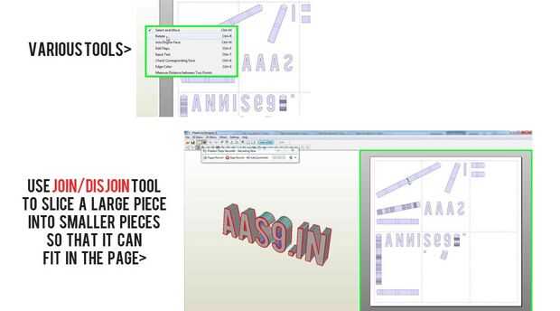 tamaño, así que ¿qué hacemos ahora?, solución es muy simple, si usted haga clic derecho, tendrás un montón de herramientas tales como rotar, seleccionar y moverán, unir/separar, etc. para solucionar el problema seleccionar join/retirar la herramienta y luego cortar la pieza grande en varios trozos más pequeños. luego utilizar otras herramientas para cambiarlo así que todo encaja perfectamente en la página