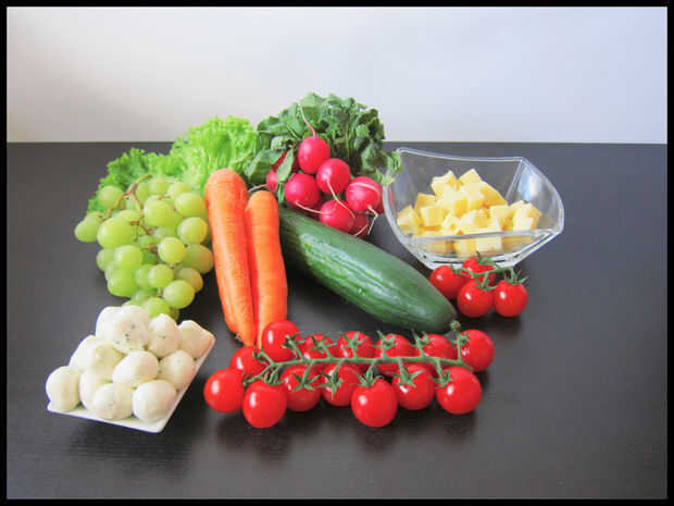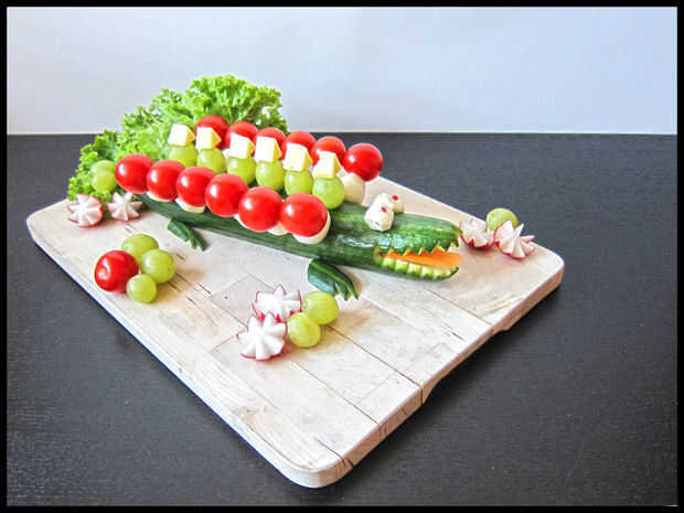 Pegar un montón de palillos de dientes en la parte posterior del "cocodrilo" y el lugar de tomate con mozzarella o uvas con queso en ella.