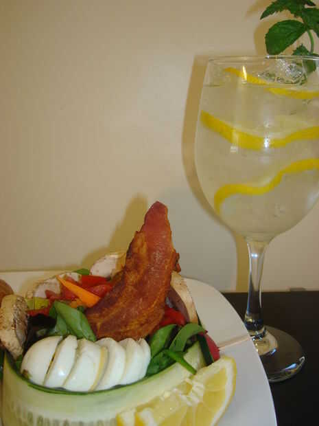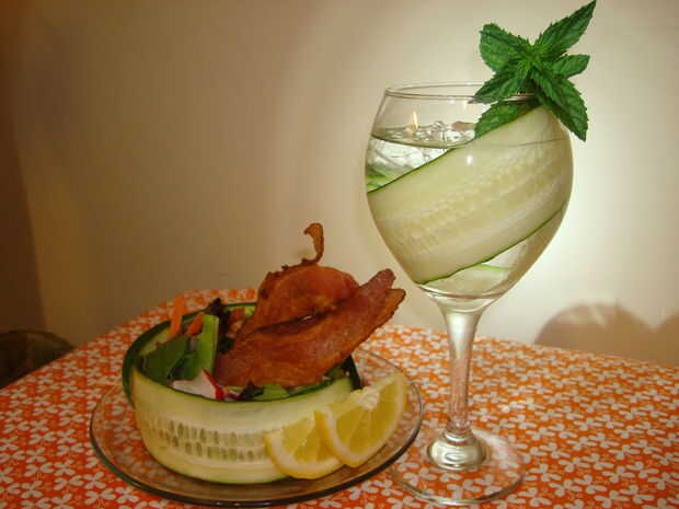 Hice mi ensalada un poco diferente porque no tengo una manera de cortar las rebanadas delgadamente bastante. También se utiliza los elementos de la ensalada que tenía en mano. Preparar una sola porción de ensalada y utilice la rodaja de pepino como el tazón de fuente. Decorar con el tocino crujiente. Pensé que estaba tomando 2 rebanadas de tocino amplia tenía lejos de la mirada de la taza usé sólo una rebanada.