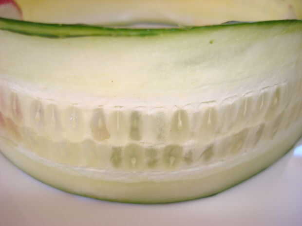 1 laminas de pepino sin pelar con semillas que muestran.