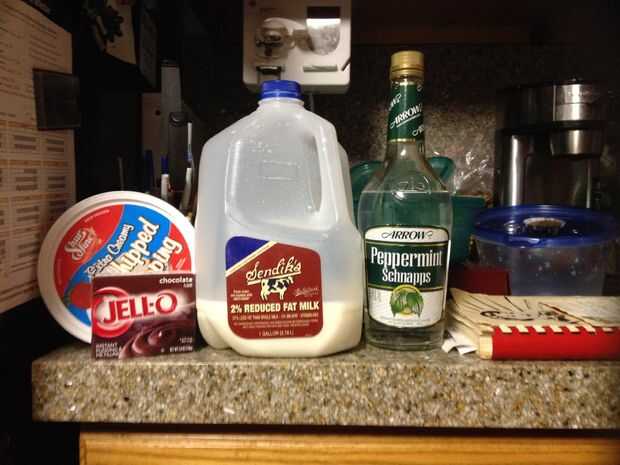a hacer peppermint patty tiros de pudín necesitará: 1 cajita de Pudin de chocolate 3/4 de taza de leche 3/4 de taza de licor de menta 1 tina de cool whip Caramelo de menta triturada