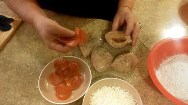 Pepperoni cosas 4 y tanta mozzarella como usted puede en cada pechuga de pollo.