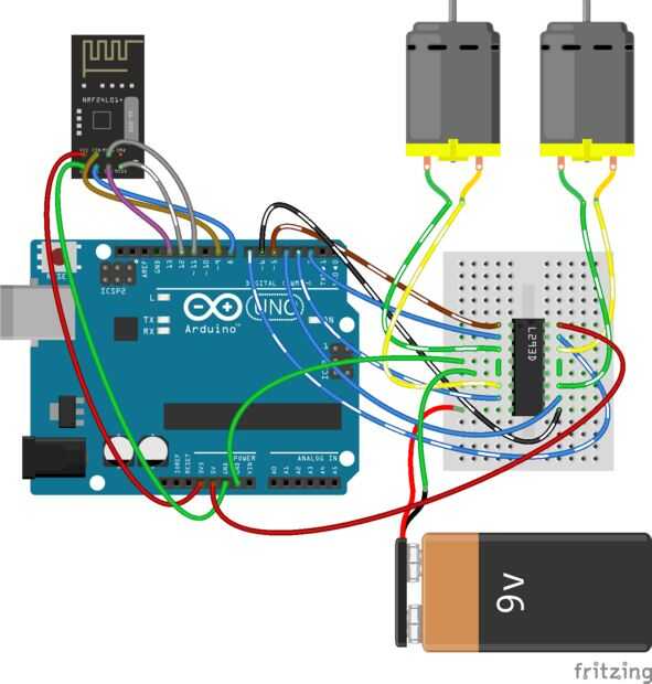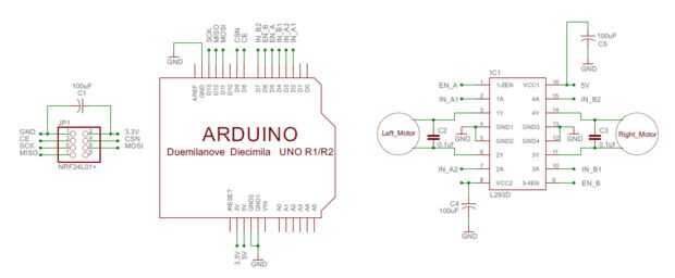 Nota: los condensadores en el módulo de motor y nRF24L01 + son utilizados para filtrar perturbaciones de ruido EM que pueden provocar comportamientos erráticos. Usted también puede tener que usar una sección de potencia bien diseñado si no usas el tablero original de UNO.