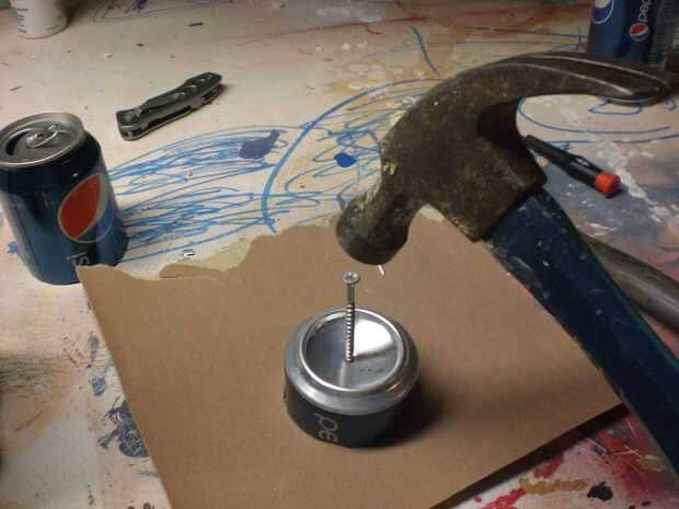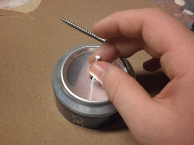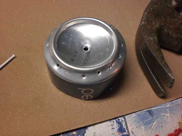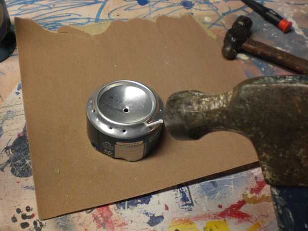 nosotros un clavo grande para el combustible de puerto en el centro de la depresión en la parte inferior de la lata. nosotros un pequeño clavo o alfiler para los chorros de combustible Recuerde que usted puede hacer la cerveza de los puertos más adelante así que ellos smal y luego por ensayo y error hacen más grande si es necesario.