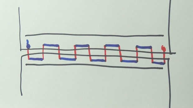 Así que encima es un dibujo rápido de cómo trabaja la puntada escalera. La clave de color es:
