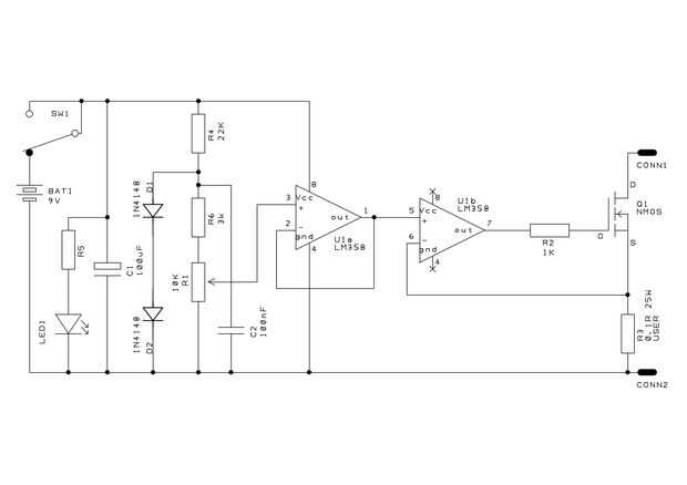 Yo he desarrollado yo mismo un banco PSU y finalmente llegó el punto donde quiero aplicar una carga a él para ver cómo funciona. Después de ver el excelente video de Dave Jones y mirando algunos otros recursos de internet, se me ocurrió con la pequeña carga. Se trata de una carga actual constante ajustable, que debe ser capaz de manejar alrededor de 10 amperios. El voltaje y la corriente están limitadas por la calificación del transistor de salida y el tamaño del disipador de calor.