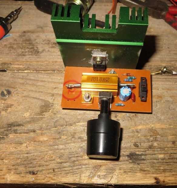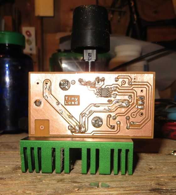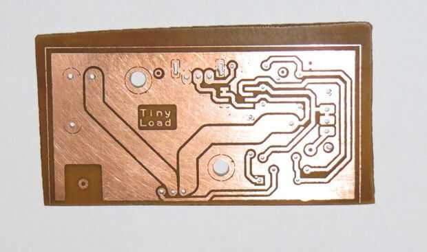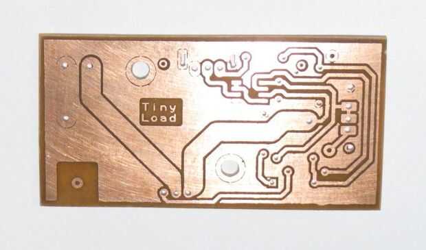 Las pistas gruesas mientras no realmente lo suficientemente gruesas como para 10 amperios con el tablero de copperclad de 1 oz usado, por lo que es abultado para arriba con un alambre de cobre. Cada una de las pistas tiene un pedazo de alambre de cobre de 0,5 mm puso alrededor de él y tachuela soldada a intervalos, excepto el corto tramo que esté conectada a tierra, como plano de tierra añade un montón de bulto. Asegúrese de que el cable adicional va directamente a los pines mosfet y resistencia.