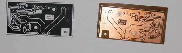 Hice el pcb usando el método de transferencia de tóner. Hay una gran cantidad de literatura en la red sobre esto así que no entraré en él, pero el principio básico es que use una impresora láser para imprimir el diseño sobre papel brillante, y planche en la placa, luego lo grabe. Yo uso poco tóner amarillo barato transferencia de papel de China, y una plancha de ropa situado a poco menos de 100° C. Usar acetona para limpiar el tóner. Sólo mantener limpiar con trapos con acetona fresca hasta que limpia. Tomé un montón de fotos para ilustrar el proceso. Hay mucho mejores materiales disponibles para el trabajo, pero un poco más allá de mi presupuesto! Generalmente tengo que retocar mi transferencias con un rotulador.