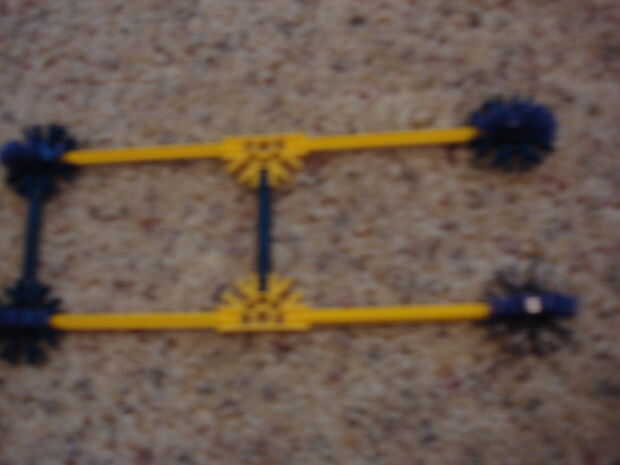 Ahora, conseguir todos los conectores 3d azul y púrpura. Fije un azul a púrpura, por lo que tiene un piso base, repetir para el resto de ellos. Luego, coloque en los extremos de la Base, así que la línea violetas con los amarillos. (Ver foto). Fije un lado con uno de los azules restantes, por lo que las barras azules son paralelas.