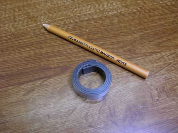 El problema con la hoja de metal es más corto que el lado del espacio de costura. Para evitar que se estancia en el lado, usé 2 flacos palitos cortadas en 1,5 pulgadas, palillo debajo de las vigas de dos tablero. Me corte un pedazo de cinta magnética con un lado adhesivo y pegarlo al lápiz para evitar que el lápiz corriendo. Un trozo de tela de toalla de microfibra borra la escritura de tiza. Con un marco de fotos magnético y una foto impresa de mí con mis hijos, estoy rodeado de amor cuando cosen.