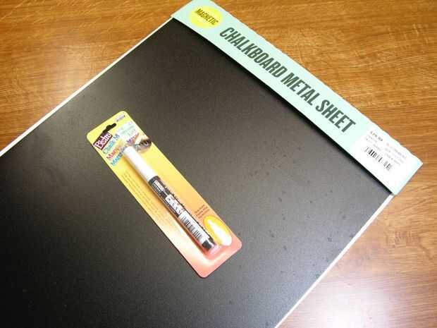 Recibí la hoja de metal de pasillo de la manía que tiene un surtido de metal negro pizarra. Como se muestra que en un solo viaje puse un marcador de pizarra a Hobby Lobby. Lamentablemente no escribe por lo que tendrá que ser devuelto. Encontré el lápiz de tiza fabricante vestido blanco ya tengo funciona perfectamente en su lugar.