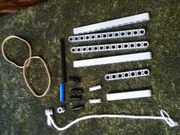Necesita 4 piezas technic con piezas technic 13 agujeros 2 con 7 orificios de 1 eje (largo 8 agujeros) eje 2 tapones 6 clavijas (cualquier color) 1 3 largo peg (cualquier color) y un poco de cuerda de largo suficiente para alcanzar su dedo medio y el eje