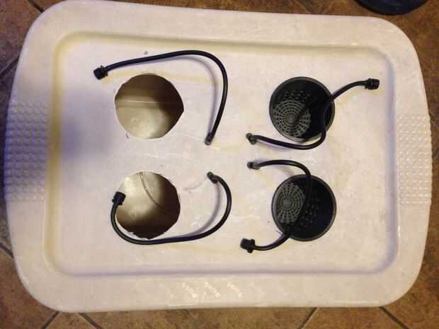 Una vez que los agujeros se cortan, cuatro pequeños agujeros para la tubería de perforación... utilizar tubo negro como esto detendrá algas obstruyan sus líneas. Usé los conectores que les vinieron con los goteros regulables y superglued a la tapa. He usado claro tubo dentro del recipiente y exterior negro. Se puede utilizar tubo negro todas si quieres.