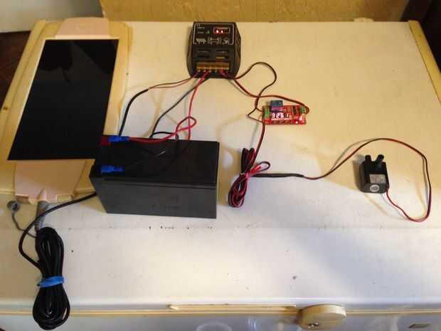Extienda el cable de la bomba, así por lo que llegará a la bolsa y en su caja de plástico de la batería. Soldadas alambre extra para la bomba, utilizar silcone en las conexiones y encogimiento envuelto para lo impermeable. Usé un recipiente de tapa claro $3 snap para la caja de la batería/electrónica de WalMart. Yo se poner algo encima de la caja para guardarlo bajo la sombra. Elegí una caja clara, así que como estoy trabajando en el patio será capaz de ver el nivel de carga del LED en el controlador de carga y el LED del temporizador para que pueda ver a simple vista que todo está bien con el sistema. Mi panel solar es un poco pequeño necesito cambiar la batería y recargarla periódicamente, esperemos que no, pero vamos a ver cuando las plantas están en ella cuánto necesitan la bomba en funcionamiento.