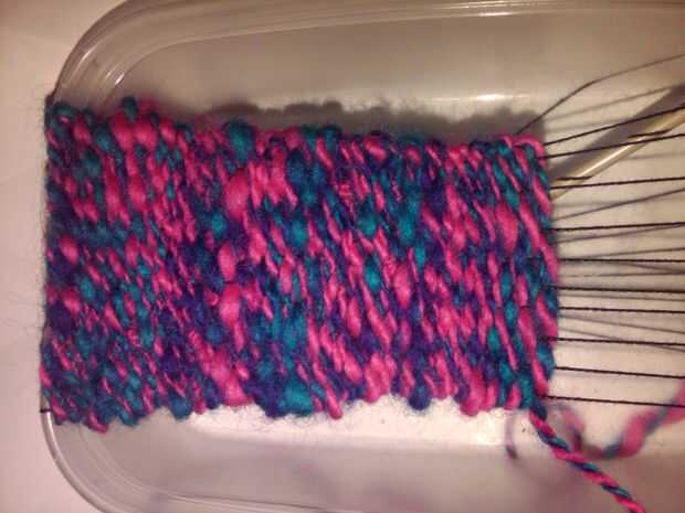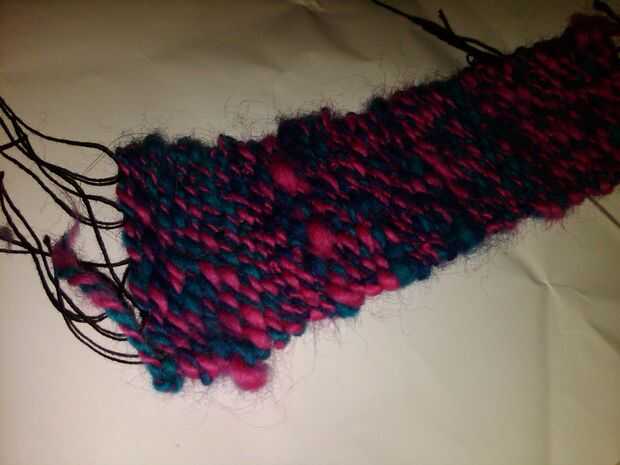 Movimiento... Obviamente la quita la caja me dio sólo tantas opciones de tamaño - pude hacer los hilos de la urdimbre más cerca juntos y mover a la tela tejida alrededor de la caja para permitir más espacio crear una pieza grande de tela, pero hay limitaciones definidas a él. El pedazo más grande de tela que me imagino lo que me permitía hacer es alrededor de 10" de largo y 4" de ancho - para ser útil, tendría que crear muchos de ellos y coserlas juntas. Esto podría ser interesante visualmente, pero no del todo lo que tenía en mente cuando estaba pensando en tejer inicialmente. Por ahora, estoy planeando experimentar con un marco de fotos, para hacer algo más largo/ancho - que haciendo una bufanda fuera de él. Voy a ser con fotos cuando he conseguido!
