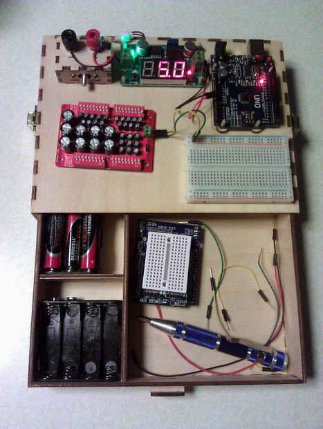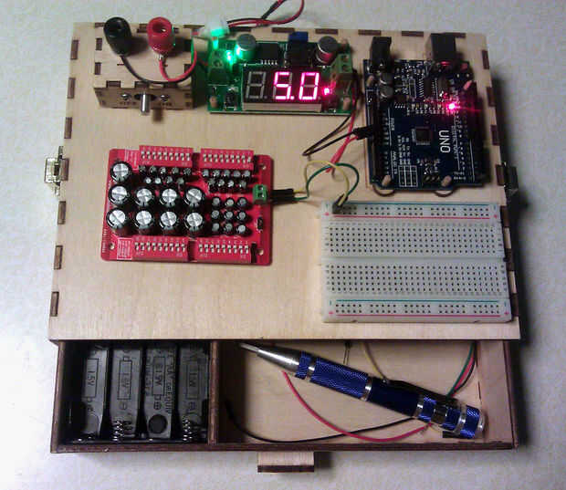 Ya que no hago grandes proyectos electrónicos, esto sólo debe ser suficientemente grande para contener un protoboard, un Arduino y algunas otras partes. Quería pilas para no tener que ocupar espacio con una fuente del Banco cada vez que quería probar un circuito simple. Yo también quería una tapa de protección para el almacenaje y un cajón para mantener las baterías y algunas piezas sueltas. Las dimensiones de esta estación son 8" ancho 6" profundo y unos 1.75" altura, sin tapa.
