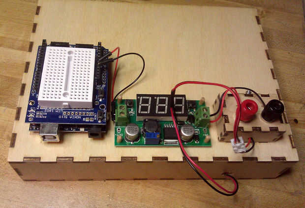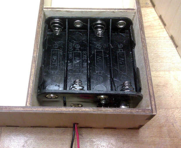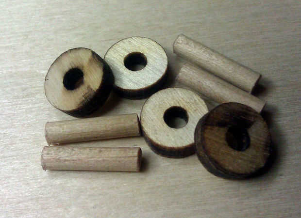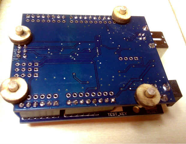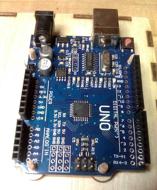 El pequeño bosque "arandelas" en el archivo de piezas son separadores para permitir que el Arduino montado pero desprendible. Las arandelas se pegan a los tacos que aproximadamente 1/8" sobresalir de la parte inferior y los extremos largos se presionan en el Arduino los agujeros de montaje. Los tacos deben quedar ajustados, pero puede ser que necesite lijar un poco para que encajen. Arduino se puede entonces presionar en los orificios de la base.