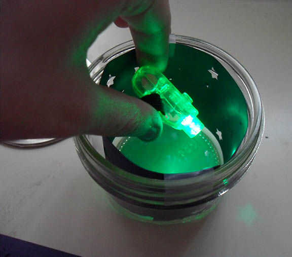 Poner el LED o luz del té eléctrico dentro del frasco. Usé un LED verde "luz del dedo" en la tienda de dólar.