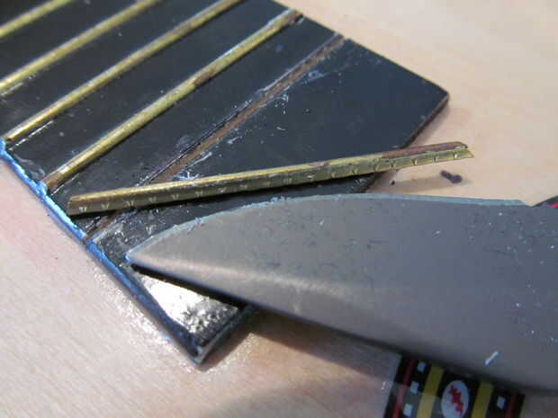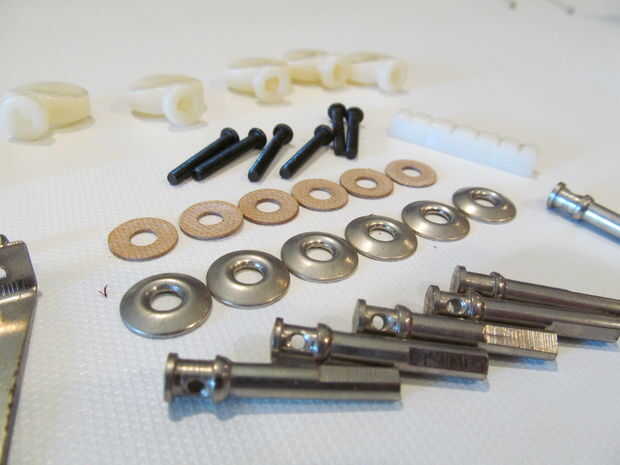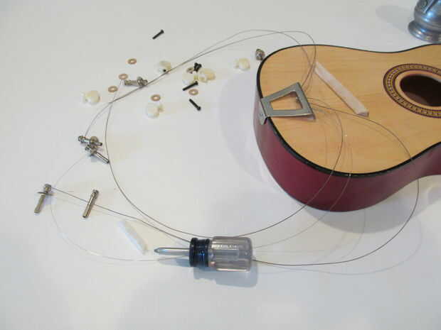 Esta parte es bastante recta hacia adelante. Desenrollado de las cadenas y me quitó el hardware. Era un poco más difícil de quitar los trastes pero mi cuchillo de bolsillo hizo brevemente el trabajo de él. Me aseguré de poner todas las piezas en una bolsa de plástico.