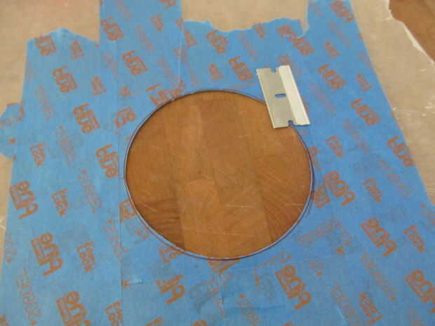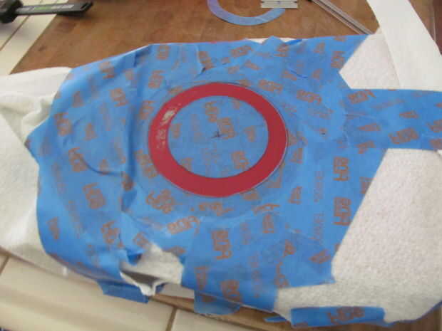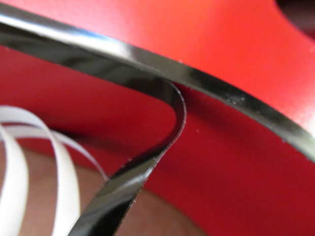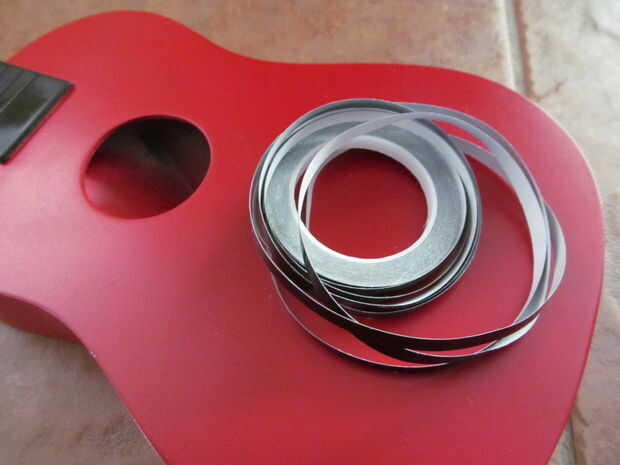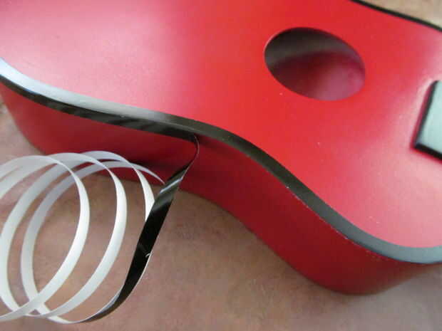 tuve pin desmontaje de un auto de derby pinwood. Pensé que podría funcionar bien aquí. Es fácil de trabajar. Apenas pele apagado el forro y trabajar alrededor de las curvas. El anillo fue hecho colocando cinta de pintor sobre papel encerado y curado de círculos. Después de la transferencia de la cinta a la guitarra he pintado negro.