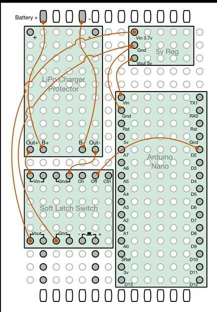 El esquema adjunto muestra la disposición de las patillas de la cabecera y el esquema que va junto con el circuito en el paso anterior. Observe que el diagrama se dibuja abajo del punto de vista de la Junta, que es la perspectiva que generalmente estoy trabajando al soldar los cables en su lugar y cabeceras.