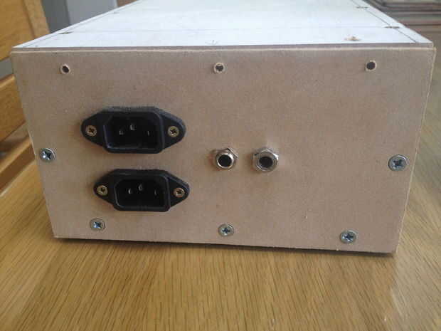 La parte posterior de la caja tiene dos zócalos IEC para 240v en y uno de 240v que también tiene un conector jack para el manto de la temperatura y otro para los 12v hacia fuera.
