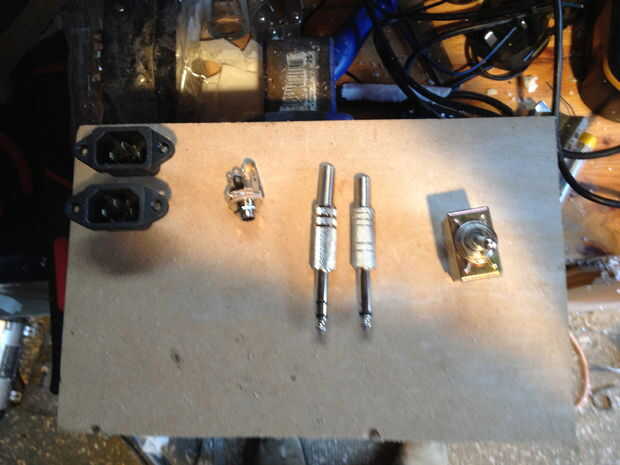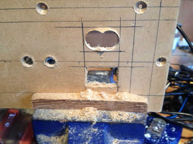Lo mismo vale para la parte trasera me había marcado hacia fuera las tomas IEC y taladrar los agujeros para los conectores, luego hecho recto con una escofina plana, mientras que los paneles fueron en el taladro de columna he perforado y había avellanado de los agujeros de tornillo.