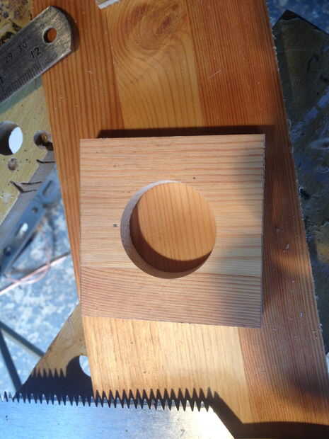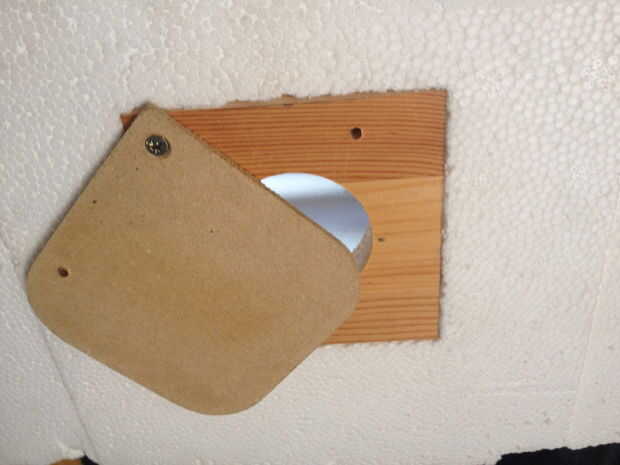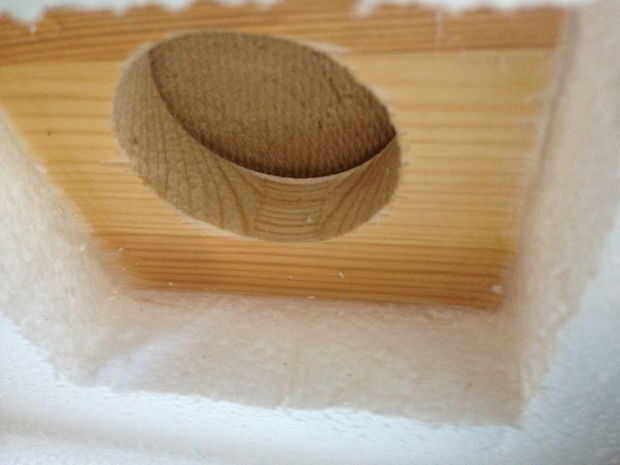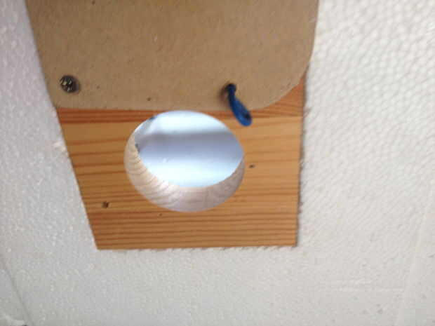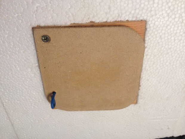 Como balancea libremente tendrá un método para dejar de apertura todo el tiempo así que perforé otro agujero de 4mm al azar pero está diagonalmente enfrente de un lugar mejor como puede perforar una serie de agujeros para mantener abierto en diferentes puntos, que sólo tenía tres. A continuación, desea cortar una longitud corta de cable de núcleo sólido (no flexible) y doblar en forma de 'P' sosteniendo en unos alicates de punta para doblarla. Entonces usted quiere cortar un agujero de 85 mm x 85 mm en la caja de poliestireno. Primero la taladré con la broca de 58mm y cuadrados con la escofina, este bit es muy desordenado y las perlas de poliestireno conseguir por todas partes.