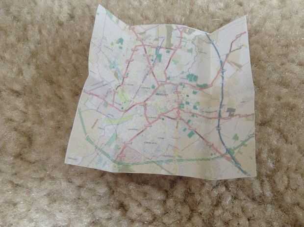 Cortar el mapa cuadrado y doblar en cuartos con el medio pliegue un doblez de la montaña y los dobleces de Valle de pliegues externos. Luego doblar todo el mapa por la mitad