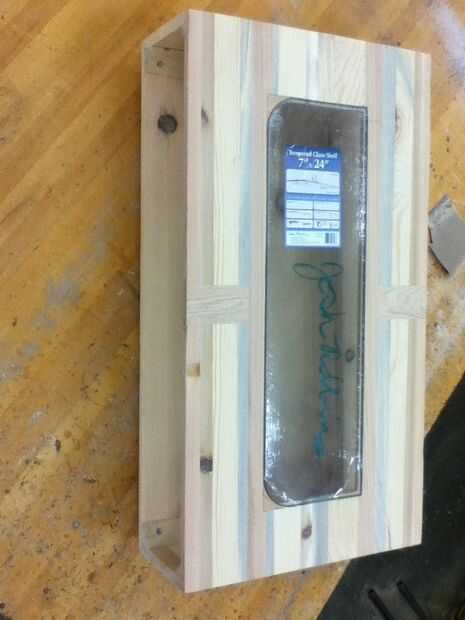 Corta el pino y el roble en 1-3 de 35 pulgadas piezas y plano de toda la madera por ambos lados para pegar primero pegar piezas suficientes para hacer de 20 pulgadas de ancho tambaleó el pino de color diferente (necesitarás dos de ellas). Luego tendrás que pegar encima de un pino más suficiente para hacer 2 7/20 pulgadas piezas. El roble que ponen en más adelante el pino fue todos pegado juntos.